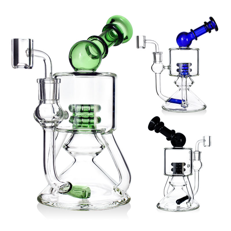 Frequently Asked QuestionsA recycler dab rig continuously cycles water and vapor through multiple chambers. This advanced filtration system provides incredibly smooth, clean, and flavorful hits by preventing splashback and ensuring your water remains fresh, leading to a superior dabbing experience.The double showerhead percolator maximizes diffusion by forcing vapor through numerous small slits, creating a high volume of fine bubbles. This extensive water contact cools the vapor significantly and enhances filtration, resulting in exceptionally smooth, flavorful, and less harsh dab hits.A high-quality quartz banger is essential for dabbing because it provides superior heat retention and is non-porous. This allows your concentrates to vaporize efficiently at optimal temperatures, ensuring you get the purest flavor profile and minimizing residue buildup for a clean taste.For optimal performance and taste, regularly clean your dab rig. We recommend using isopropyl alcohol and coarse salt. Swirl the solution within the rig to dislodge concentrate residues, paying attention to the percolators. Rinse thoroughly with warm water afterwards. Consistent cleaning helps maintain the rig's efficiency and pure flavor.This dab rig is constructed from high-quality borosilicate glass, known for its exceptional strength and resistance to thermal shock. This robust material ensures its overall durability for long-lasting use and a pristine appearance, even with regular use. -