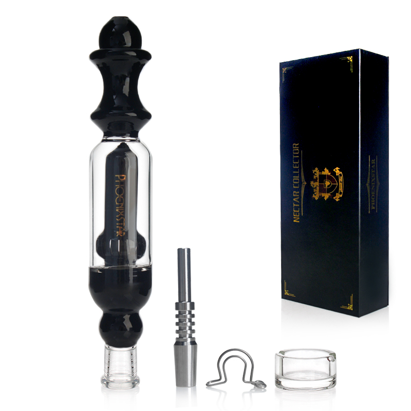 Phoenix Star Nectar Collector Kit PNC09 includes a glass bubbler, titanium nail, wax dish, and stainless steel clip, all packaged in a stylish gift box.