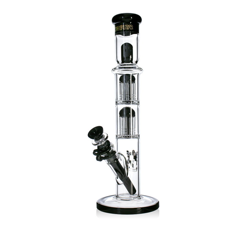 How do I fill the water levels in the dual percolators?For the best results, fill water through the mouthpiece until the top tree arms are slightly submerged. Then, pull air through to let the water drop into the bottom chamber. Adjust until both sets of 8-arms are just covered.Is this bong easy to clean?Yes. Because it is a straight tube design, you can easily use salt and isopropyl alcohol. We recommend a frequent rinse to prevent resin buildup in the tree arms, ensuring the glass stays crystal clear.What is the thickness of the borosilicate glass?This model features 5mm thick high-grade borosilicate glass. The wide circular base is even thicker to provide additional stability and impact resistance.Does it come with a bowl or downstem?This piece features a 14mm female joint and includes a matching 14mm male glass bowl. The straight tube design acts as a built-in downstem, feeding directly into the first percolator.How does the splash guard work?The glass is tapered just above the second percolator. This "constriction" prevents bubbling water from rising up the tube even during a vigorous draw, keeping your mouth dry.