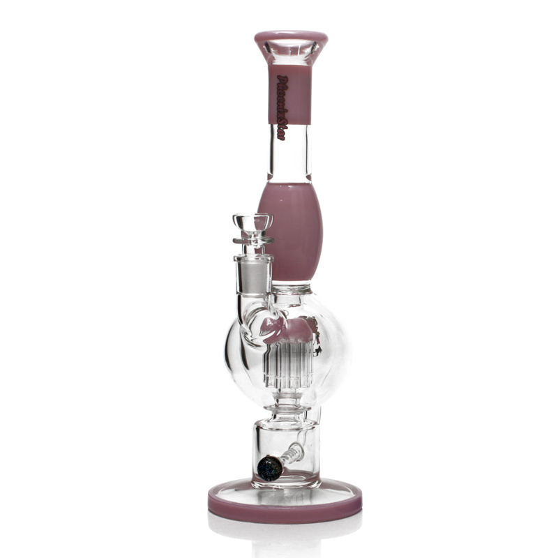 Phoenix Star 14 Inches Percolator Bong with 10 Arms Perc PHX626 is made from Boros glass with 14 inches in height. And there is a balloon shape in the middle of the tube for aesthetics. Phoenix Star recycler oil rig is equipped with 10 Arms Perc and a diffused pipe with slits. The colors of matched 10-arm perc, base, balloon shape and mouthpiece embellish each other for overall beauty. This Recycler bong utilizes a unique recycler design to keep water constantly flowing through the chamber for continuous filtration and airflow. You can enjoy the excellent flavor without any splash. The glass bong features a 10 arms perc and a horizontal channel with five slits to filter your smoke for smoother tastes. Smoke circulates to 10 arms perc to be detached to create more bubbles and more interface areas with water for smoother hits. You can watch the water rolling and bubbling via the transparent glass. what a funny recycler dab rig! Blue, green, purple, and pink colors are available.