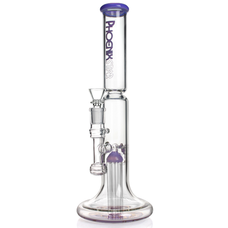 DescriptionPhoenix Star Percolator Bong PHX780 with Extensible 6 Arms Tree Perc measures 15 inches tall with reinforced fixed downstem to avoid breaking or replacing it. Made of premium borosilicate glass, this glass water perc bong is equipped with an extensible 6 arms tree perc to diffuse and filter the smoke before hits your lungs to provide you with smoother hits. And you and your customers can watch the rolling water to de-stress during smoking.