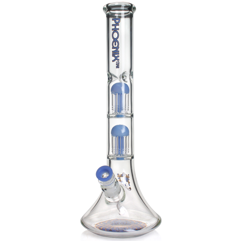 Phoenix Star 16 Inches Double Tree Perc Percolator PHX732, constructed of high-quality boros glass, is a top-of-the-line smoking device measuring 16 inches tall. This tall glass bong incorporates two sets of 8 tree percs for maximum filtration and diffusion ensuring the cleanest, coolest hits. These percolators work to break down bubbles and filter smoke for smoother hits. The built-in ice catcher enhances the cooling capacity of this glass perc bong. This feature allows you to add ice cubes to the neck of the glass pipe, creating an extra layer of filtration that further cools down the smoke. With its beaker base combined with beautiful lines, the glass percolator bong is a remarkable smoking device for a premium smoking experience. Purple, Green, Blue, and Pink 4 colors are available.
