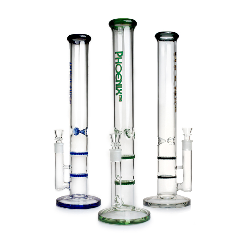 DescriptionPhoenix Star 17 Inches Percolator Bong Double Honeycomb Perc PHX354, constructed of high quality boros glass, is hand blown by Phoenix Star with 17 inches tall and 5mm thick. Phoenix glass bong is a simple straight tube with double honeycomb percs and ice catcher. The percolator bong is equipped with double honeycomb percs to diffuse and filter the smoke to offer smokers a smoother smoking experience. And the rolling water can let you eliminate worries and clam down. If you prefer the cooler hits, as long as you put some ice cubes from its mouthpiece before inhaling, the ice-cold tastes keep you cool in summer.