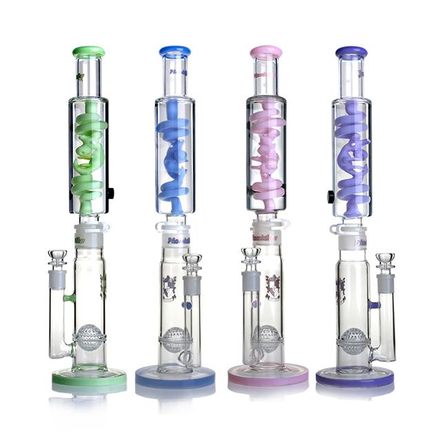 Phoenix Star 20 Inches Alien Freezable Coil Bong with Sphere Honeycomb Perk PHX490, made of high-quality borosilicate glass, measures 20 inches in height. There are two detachable parts: glycerin coil top part and straight tube base, which are connected by a plastic keck clip. One of the standout features of this glass pipe is the freezable Alien coil, which is filled with medical grade glycerin, and won't swell when frozen in the refrigerator. The combination of glycerin and the alien design provides an incredibly cool and smooth hit compared to traditional glycein coils. This phoenix glycerin bong adds sphere honeycomb perk to filter smoke efficiently when you inhale to make every hit flavorful and smooth.
