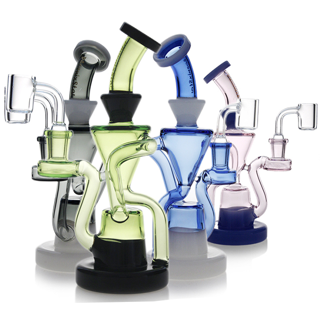 Phoenix Star 8.2 Inch Recycler Dab Rig with Quartz Banger PHX546 comes with a 14mm female joint and a 14mm quartz banger, perfect for concentrates build up and recycling. With recycler design, smokers will get silky smooth hits with more concentrate and dry herbs at one time. This recycler bong is made from borosilicate glass with 8.2 inches tall, while its bent neck acts as a splash guard for comfortable use. Phoenix star recycler oil rig looks very stylish with the mixed color accents on the mouthpiece, neck and base. This recycler rig comes in 4 colors available so you and your customers can easily find what you like.