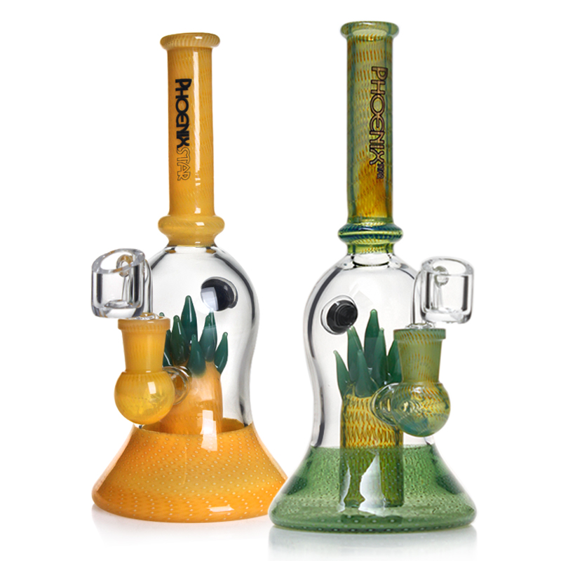 Phoenix Star 8.8 Inches Dab Rig with Pineapple Perc PHX629 is constructed of high quality American Northstar Glass Rod with exquisite appearance. The dab rig PHX629 measures 8.8 inches in height, very convenient to carry it on the go. The oil rig features a quartz banger with a curved neck design to increase the cooling time and get ideal temperatures faster for purer flavor. This phoenix star oil rig is equipped with unique pineapple shape perc for better flavor. The pineapple perc dab rig is not only unique in shape but also powerful in performance. The smoke is diffused to be more bubbles via pineapple perc when you inhale. The more interactive surface area with water lets the filtration better to offer you smoother hits. The rolling and bubbling water can calm you down to enjoy smoking fun.