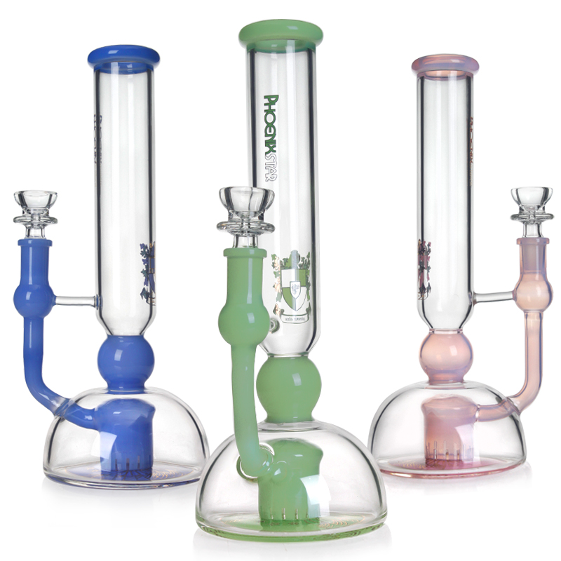 DescriptionPhoenix Star Percolator Bong PHX705 with Colored Showerhead Perc, measuring 10 inches in height, comes with a semicircular base to provide enough space for smoke filtration without splashing with your lips. The wide base bong, made from high quality borosilicate glass, is equipped with a colored showerhead perc with slits to diffuse and enhance filter smoke for smoother and fresher hits. This perc bong is a new design and has 3 colors for your choice.