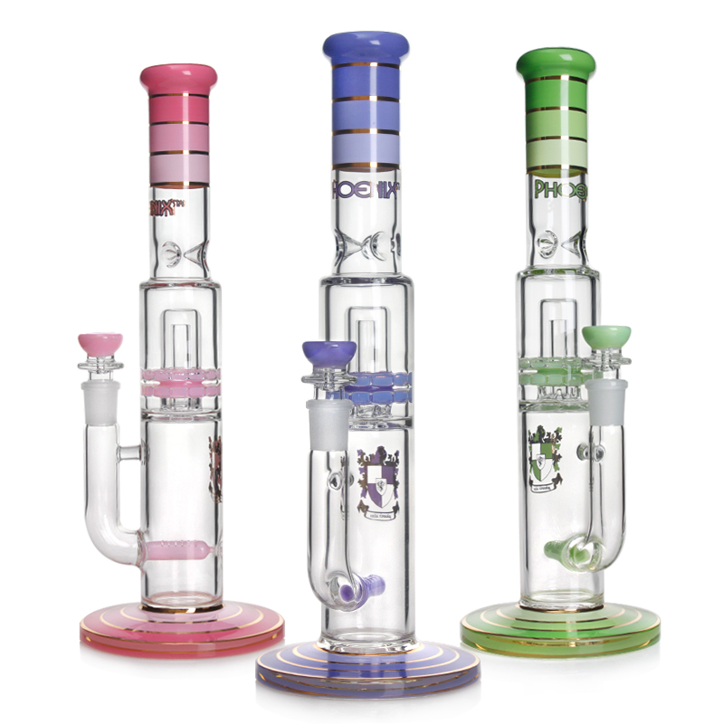 DescriptionPhoenix Star 13.5 Inches Percolator Bong With Birdcage Perc & Inline Diffuser Perc PHX664, made of premium borosilicate glass, is a beautiful glass bong with 24K gold line decoration on its neck and base. Standing 13.5 inches tall, the glass pipe with 18mm joint size sits on a sturdy and wide base that helps prevent tipping and also reduces the chances of accidental breakage. One of the stand-out features of this glass smoking pipe is two different percs: birdcage perc and inline diffuser perc. The inline diffuser perc adds even more filtration power to the equation while the matrix perc combines with U shape splash guard to prevent your lips from getting wet. These two percolators work together to provide excellent filtration, which results in a smoother, cleaner hit. In addition to the percolators, the glass percolator bong also comes with an ice catcher, which makes it possible to add ice cubes to your water pipe for an even cooler, smoother smoking experience.