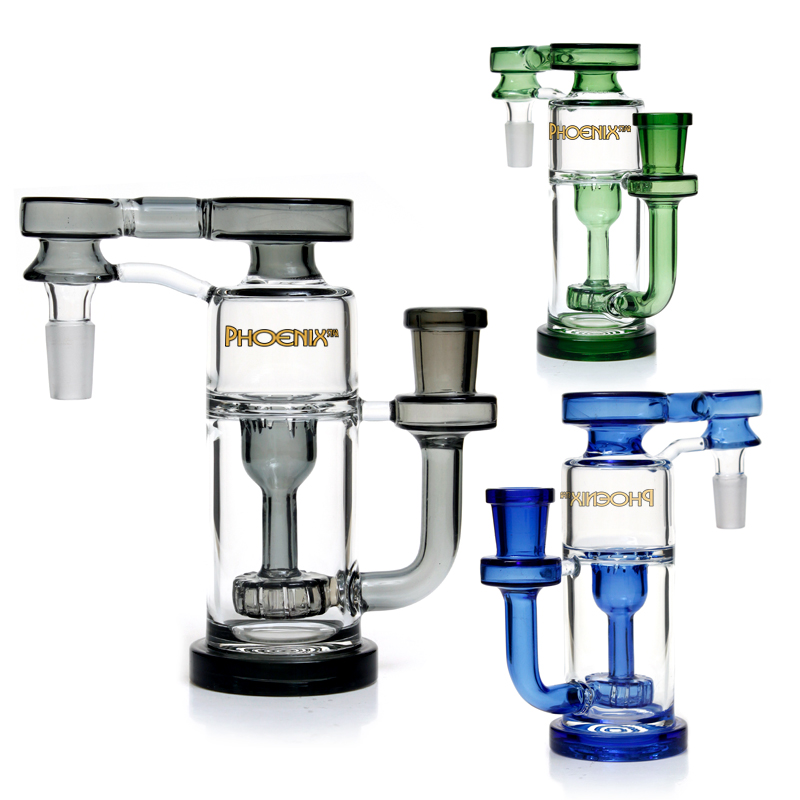 Phoenix Star Recycler Ash Catcher Bong 14/18mm Showerhead Perc is a new design for our phoenix star fans. Made from high-grade borosilicate glass, it features a showerhead perc in the chamber. The recycler design enables smokers to not only keep the water pipes cleaner but also features a recycling function to allow constant air circulation creating the most flavorful hit. There are two sizes recycler ash catchers: 18mm ash catcher and 14mm ash catcher to fit your different size water pipes. And Phoenix recycler ash catcher PHX621 is 90 degrees. It fits glass bong with 90-degree joint, 14mm or 18mm for your option. Therefore, it means you will spend less time cleaning it when you spend more time enjoying smooth hits.