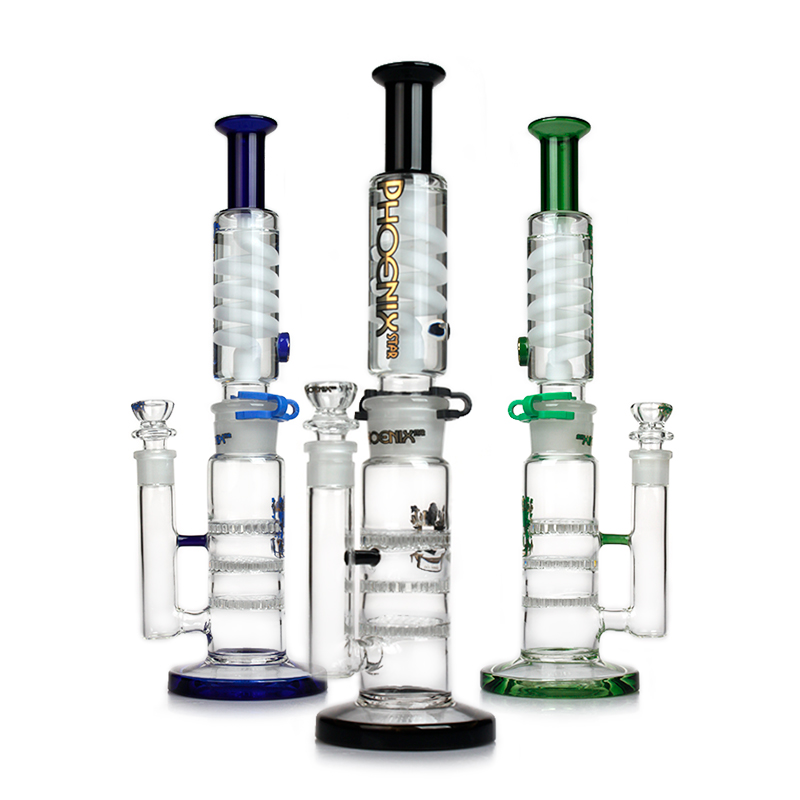 DescriptionPHOENIX STAR Freezable Coil Bong Triple Honeycomb Perc 14'' stands 14 inches tall and made from high grade borosilicate glass.The freeze bong features with a straight tube base, a fixed downstem, triple honeycomb percs chamber and a detachable glycerin coil part. Includes matching bowl and plastic clips. The top glycerin part is detachable, you can put it in freezer for a few hours before using to get a quick cooling. The triple honeycomb perc is to offer you and your customers ultra smooth smoke filtration. Those glycerine bongs are available in black, green and blue colors.