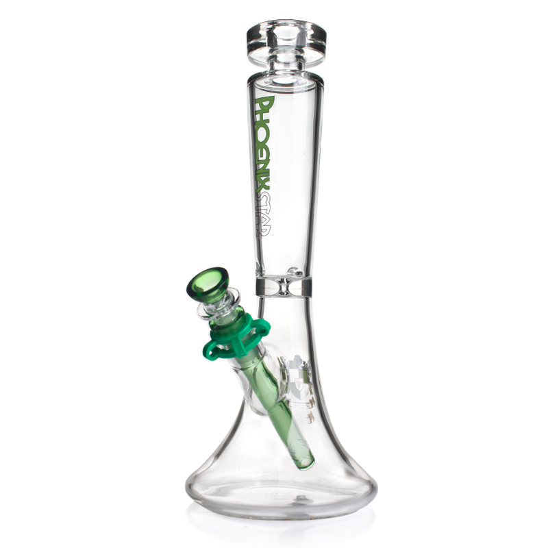 Phoenix Star 12 inch beaker bong features a gracefully rounded beaker base, enhancing its aesthetic appeal. It comes with a round ice catcher, allowing users to add ice cubes to cool the smoke and reduce irritation to the throat. This glass helix bong has several small air intakes above the ice catcher, creating a venturi effect that ensures the smoke is thoroughly swirled before inhalation, filtering it more effectively. Additionally, users can clearly observe the vortex tornado, which is the essence of the smoking experience. A slide downstem and a 14mm bowl for placing tobacco are included.