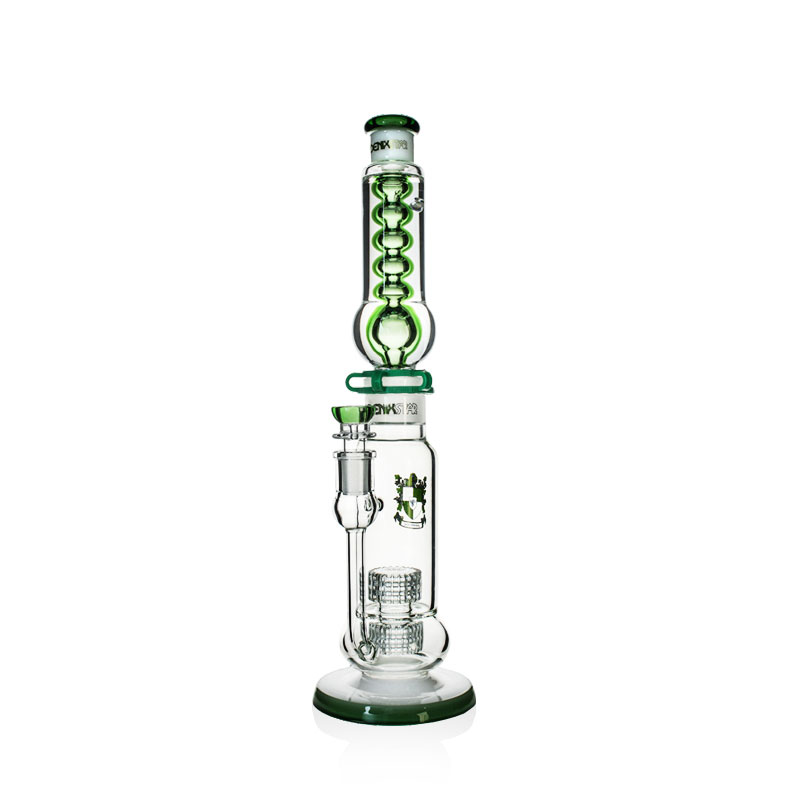 The double matrix percolators feature multiple small holes that create countless bubbles, maximizing surface area for smoke and water interaction. This results in superior diffusion, filtering impurities and cooling the smoke twice over for exceptionally smooth, clean hits.Only the glycerin-filled neck piece is designed to be frozen. Simply detach this section and place it in your freezer. Freezing the entire bong is not recommended as it could damage the glass or components not designed for such temperatures.This bong is constructed from 5mm thick borosilicate glass, renowned for its exceptional durability and resistance to thermal shock. While robust, it's still glass and should be handled with care to prevent breakage. -