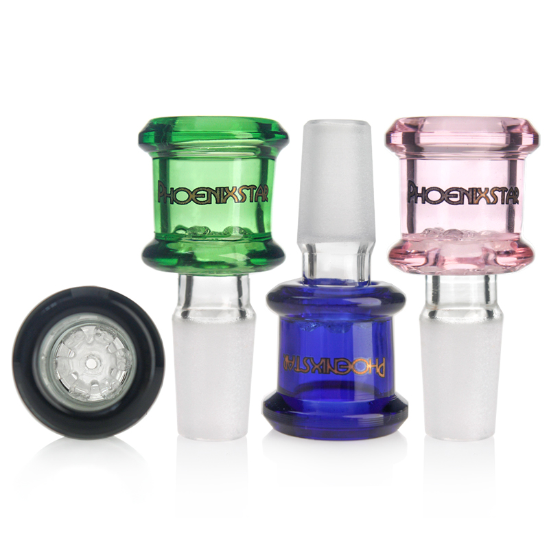 DescriptionPhoenix Star Cylinder Screen Bowl, a cylindrical 14mm male bowl with a 6-hole screen. Screens can prevent smaller particles from clogging the bong's smaller pathways that is a common issue with finer ground material. The cylindrical bowl has a larger pack capacity for longer sessions and bigger hits. Made from thick, high-quality borosilicate glass, it fits 14mm glass bongs or downstems and offers great value for money. Choose from 4 available colors.