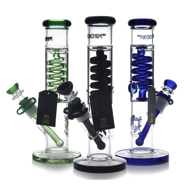 Phoenix Star 10 Inches Freezable Coil Bong with Glycerin PHX536, stands 10 inches tall as well as a wide and 5mm thick base, a compact glycerin bong to take with you easily when you travel. Constructed of boros glass, glass bong is filled with medical grade glycerin, won't swell when frozen. This freezable bong features a glycerin coil for better chilled flavor. First, you put this glycerin coil bong in the fridge for 1 to 2 hours or more. Second, you take it out of the refrigerator and use it. As you inhale, the smoke goes through the downstem and from the bottom of the straight tube to the mouthpiece. You can enjoy smoother and cooler hits.